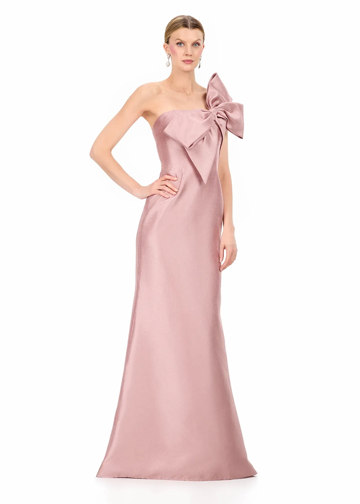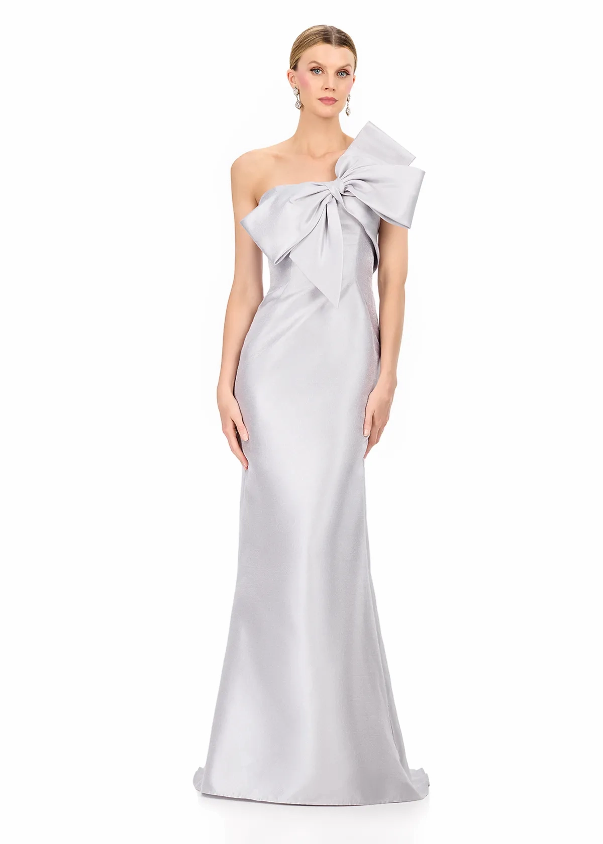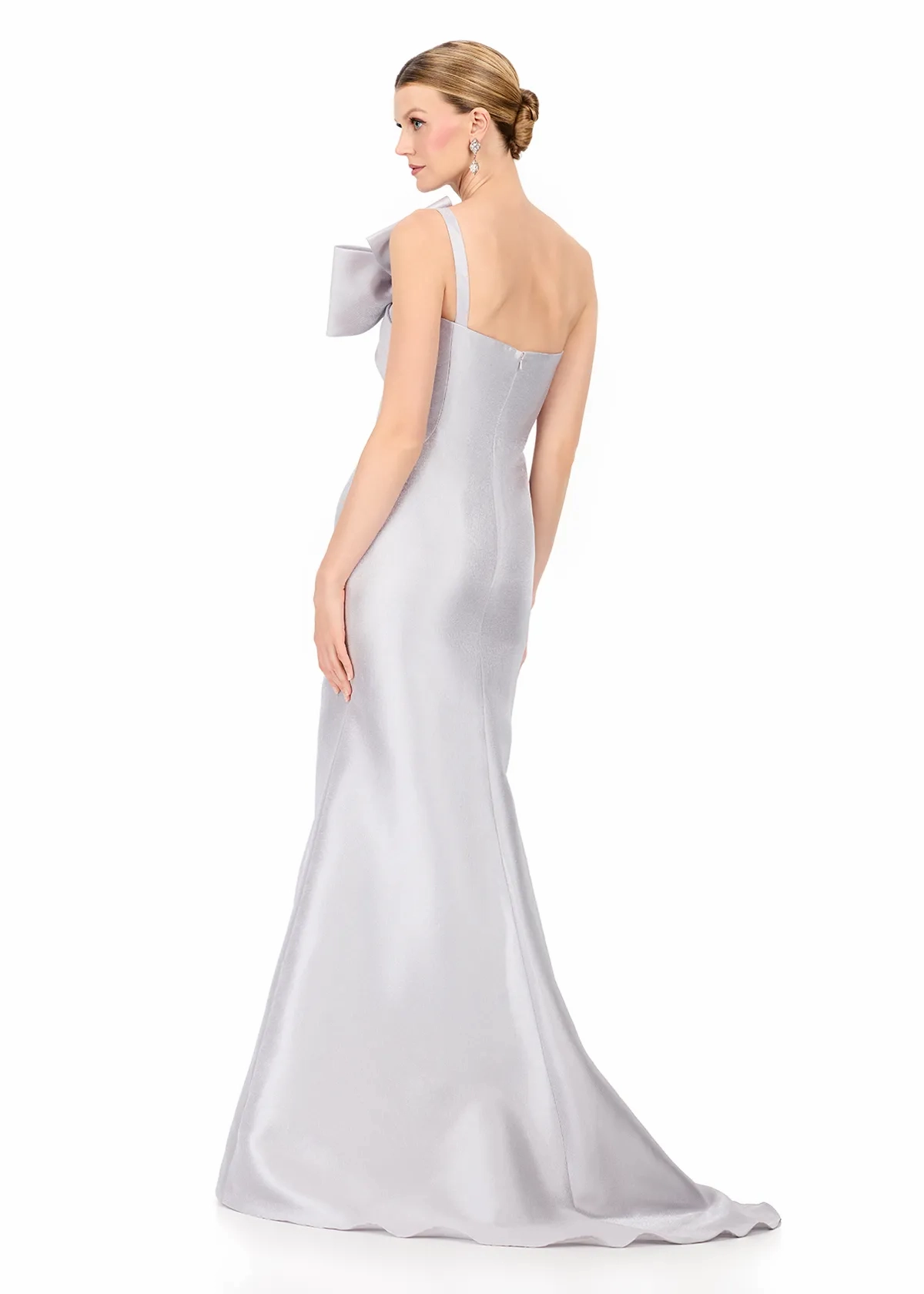 Elevate your formal wardrobe with ASHLEYlauren Style E12224, a sleek and modern strapless evening gown designed to make a sophisticated statement. Featuring a dramatic oversized bow detail and crafted in luxurious mikado, this gown blends timeless elegance with bold couture styling.