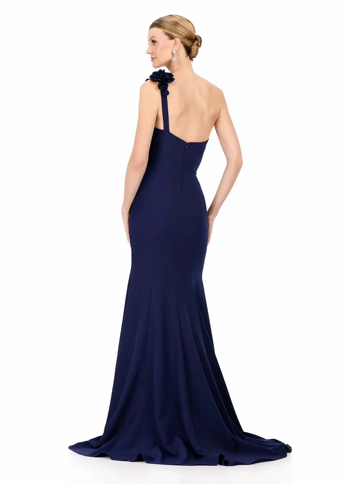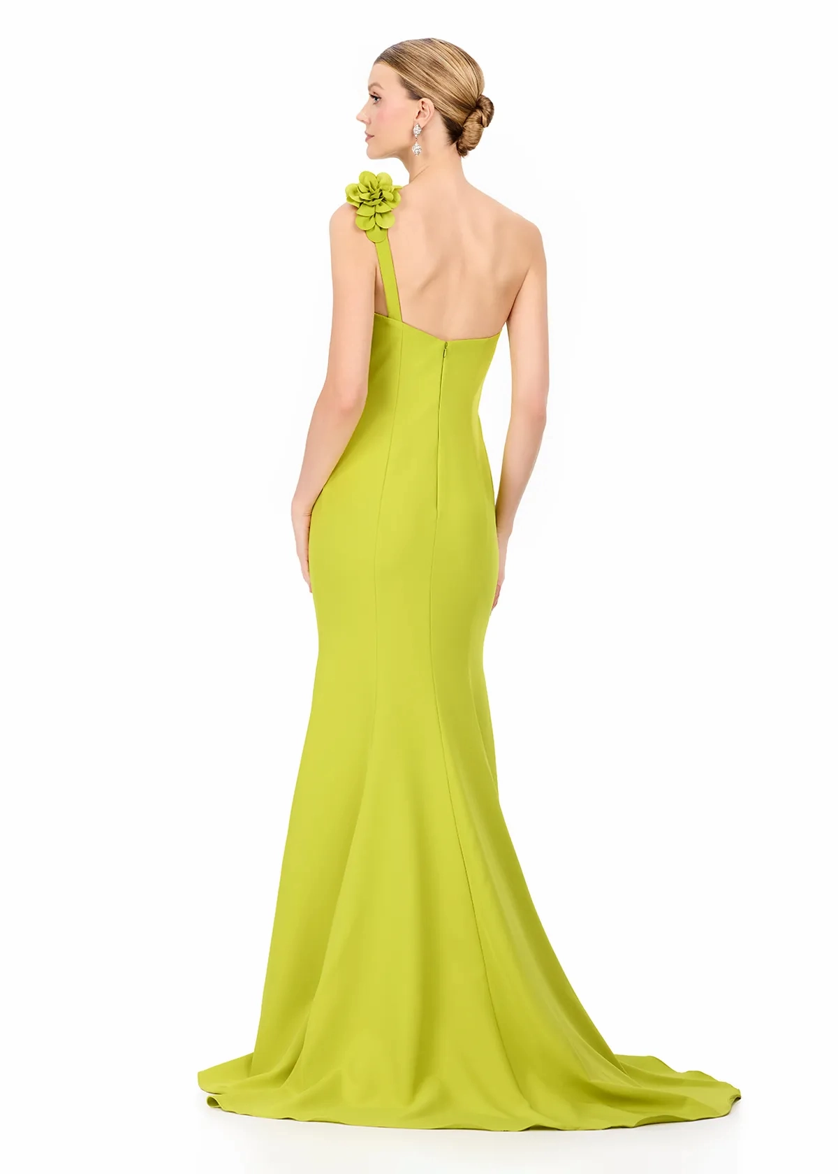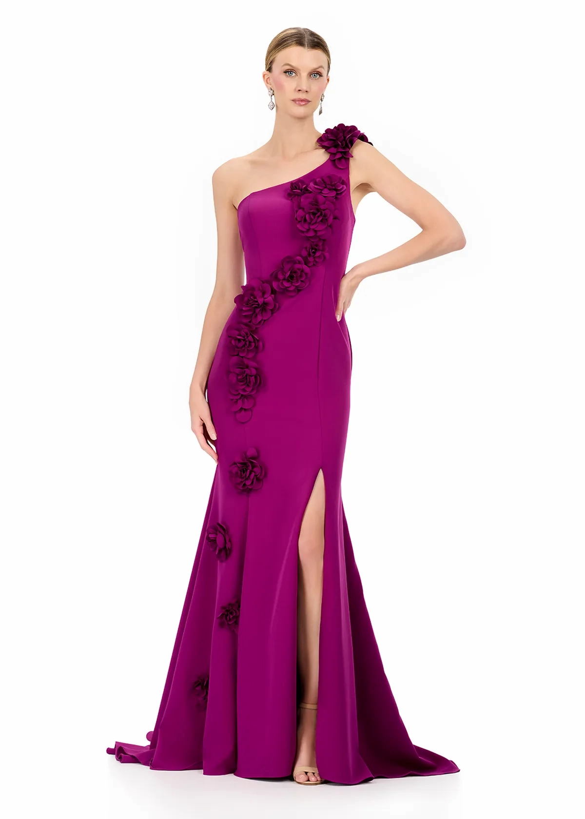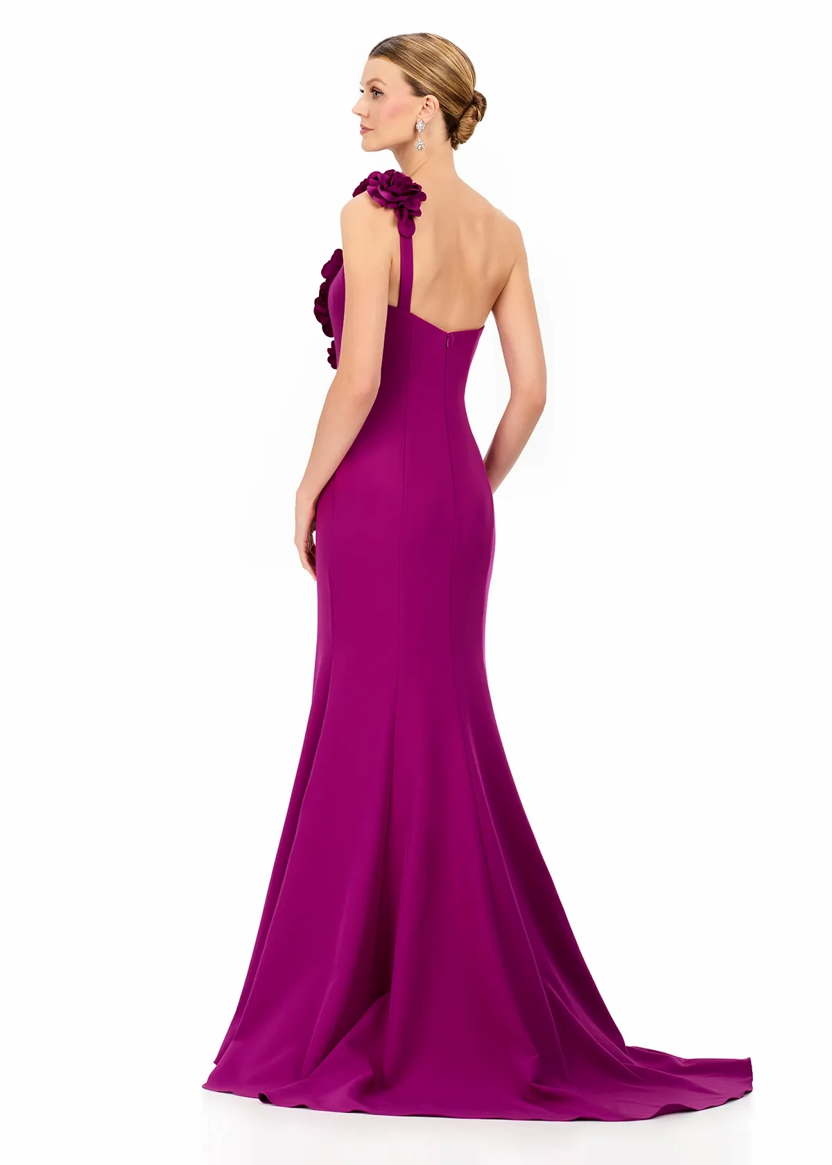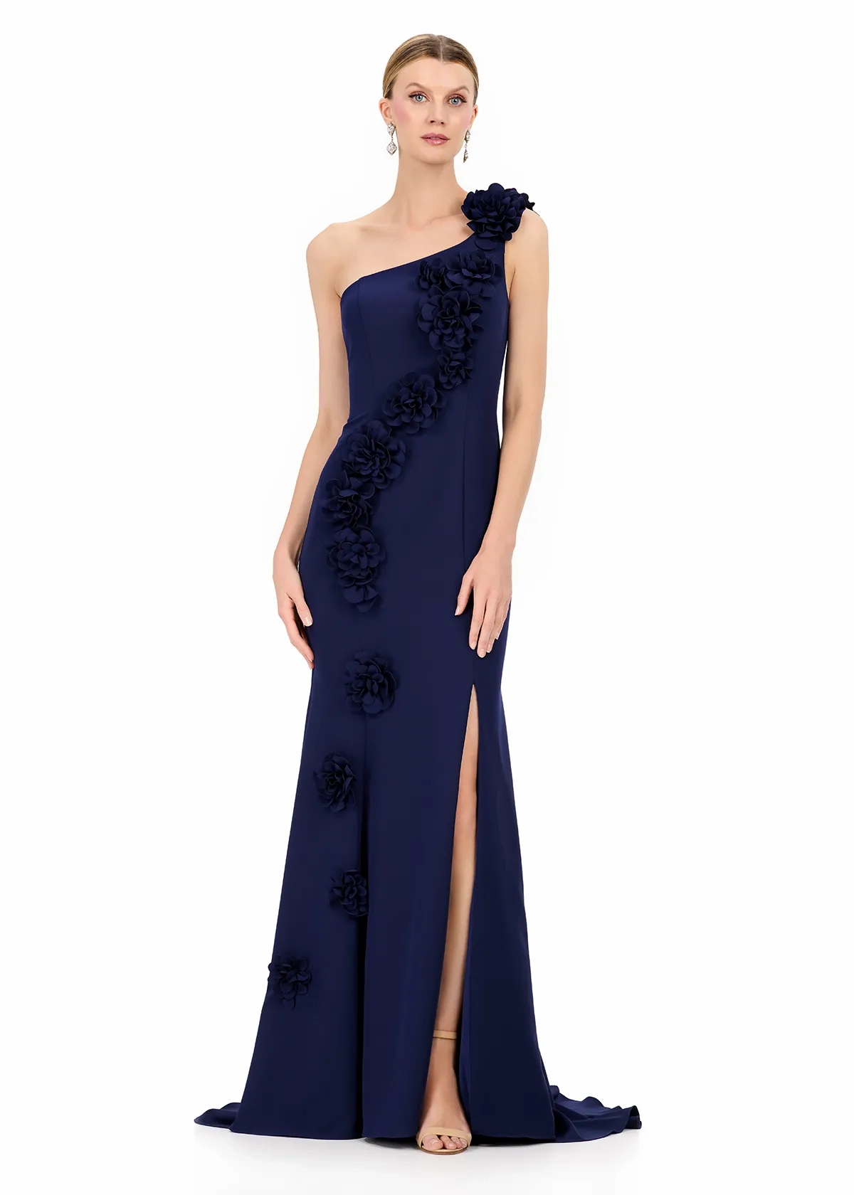 Turn heads in ASHLEYlauren Style E12245, a stunning one-shoulder jersey gown featuring dramatic 3D floral appliqués that cascade elegantly down the silhouette. Sophisticated, modern, and exquisitely detailed, this gown blends timeless glamour with couture-inspired artistry for a truly unforgettable look.