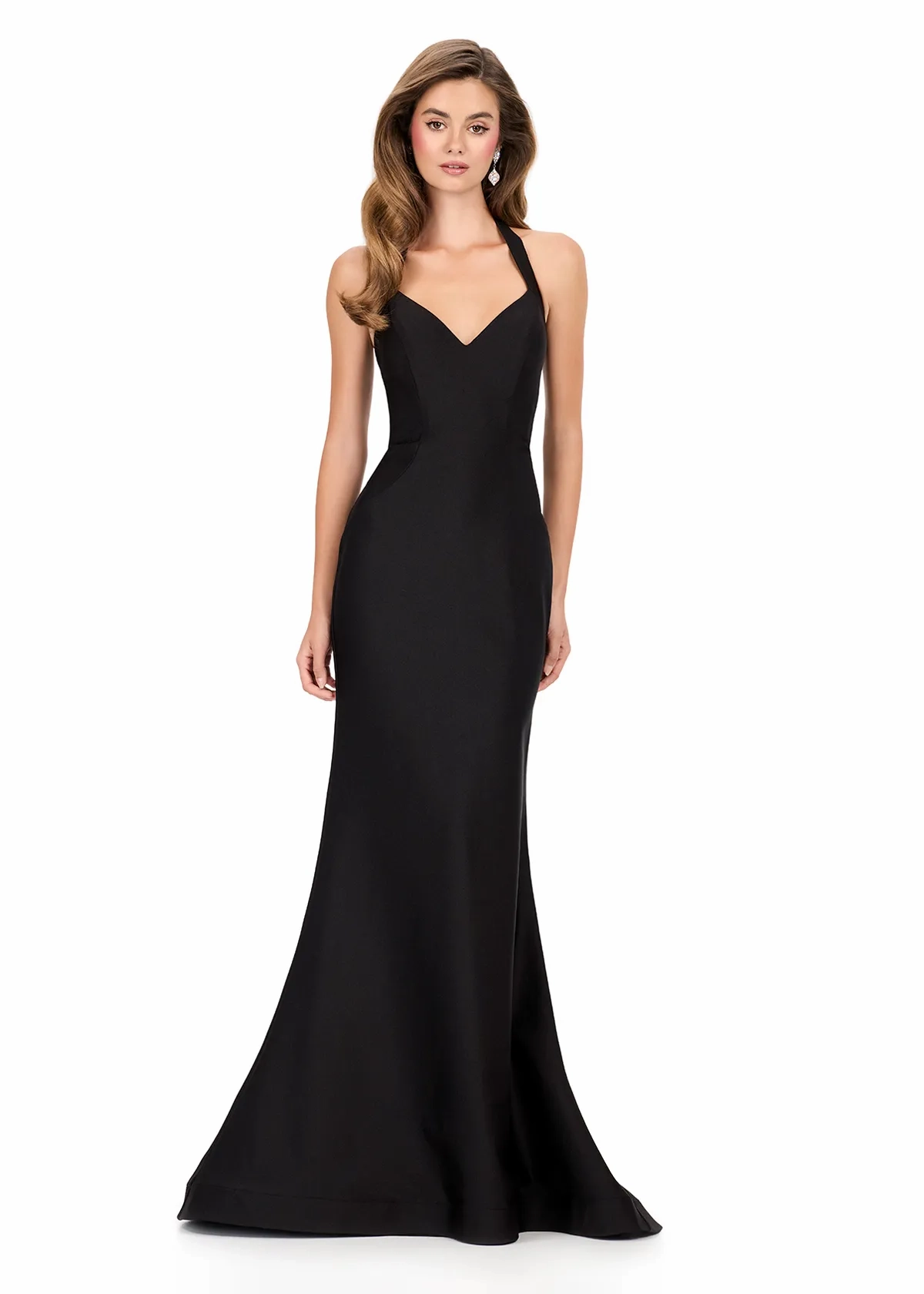 Make a statement in this sleek ASHLEYlauren Style 12205 fitted jersey gown made in custom ASHLEYlauren fabric. The strappy neckline and open lace-up back create a modern, eye-catching silhouette, while the sweep train adds just the right amount of drama.