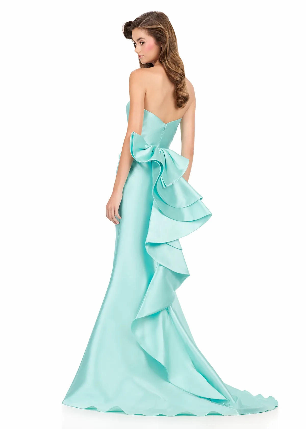 Meet ASHLEYlauren Style 12215. We love a bow moment at ASHLEYlauren. This style features a sleek fitted bodice, a dramatic high slit, and an elegant cascading bow ruffle detail down the back that adds a touch of glamour and sophistication. Perfect for prom, pageant, or any formal event, this gown combines timeless elegance with a modern silhouette to ensure you make a lasting impression.