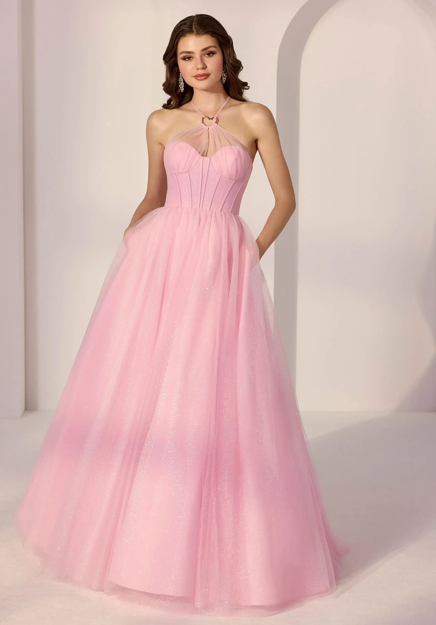 Level up your look in this glitter tulle party dress. The A-line gown features a structured bustier bodice and an edgy chrome heart halter neckline that's designed to turn heads. The crisscross back finishes the look with a simple, yet stylish flair.