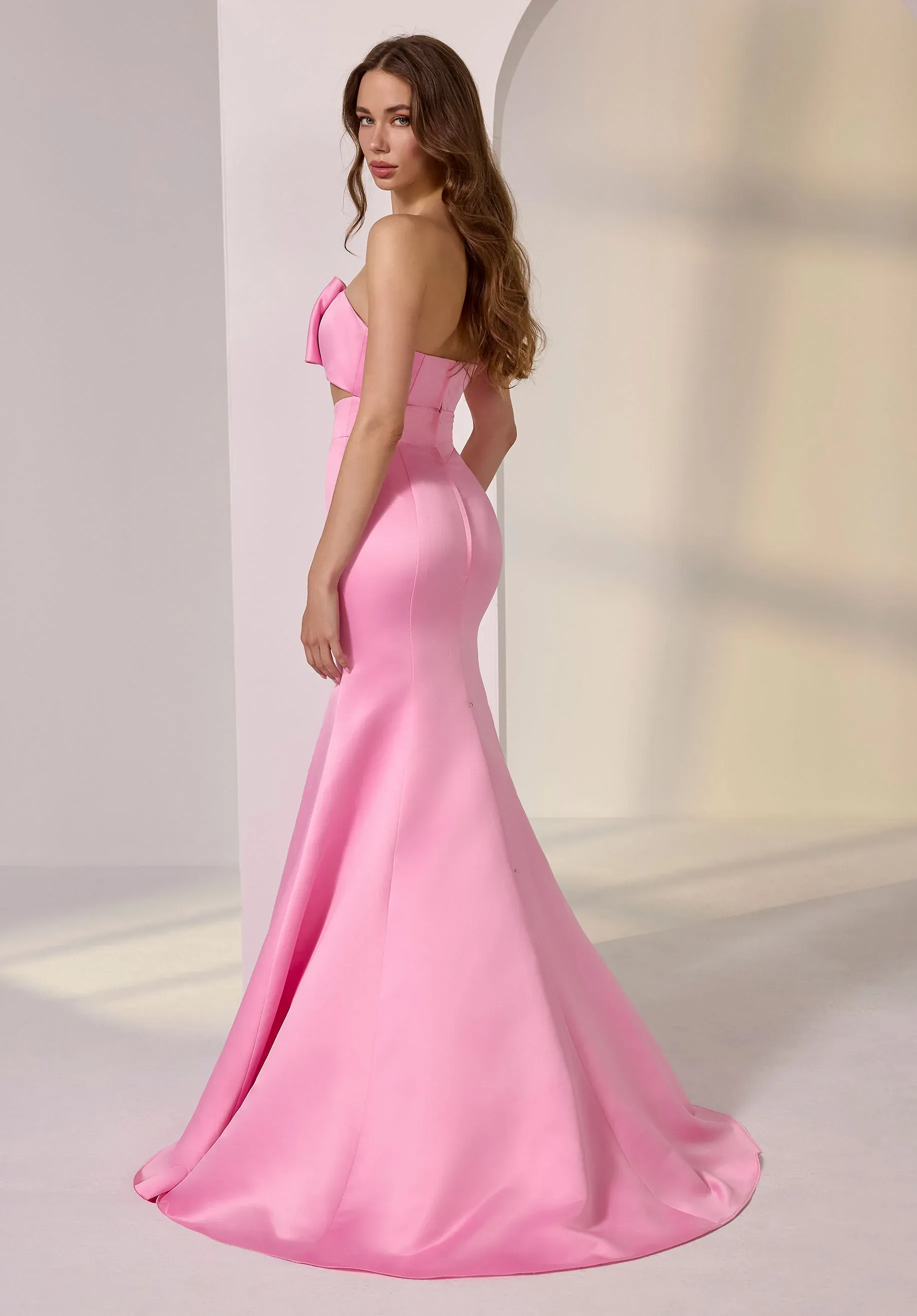 For the girls who want to look undeniably chic, meet this sleek satin party dress. The strapless cut-out bodice adds a modern edge, while the bow detail brings playful, elevated charm. The princess seams draw the eye down the mermaid skirt for an elongated silhouette. Perfect for moments that demand impact.