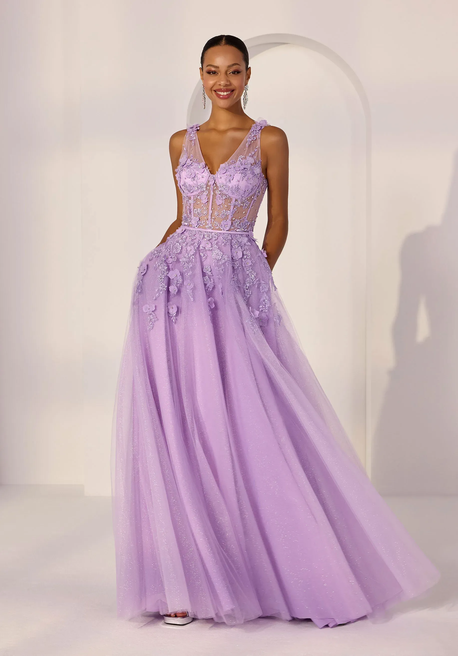 Delicate meets daring in this A-line party dress. The sheer v-neck bodice is designed with three-dimensional floral appliqués that add texture and whimsy, while structured corset boning and a lace-up back keep you cinched. The glitter tulle offers an iridescent shimmer for a dress that feels as effortless as it is elevated.