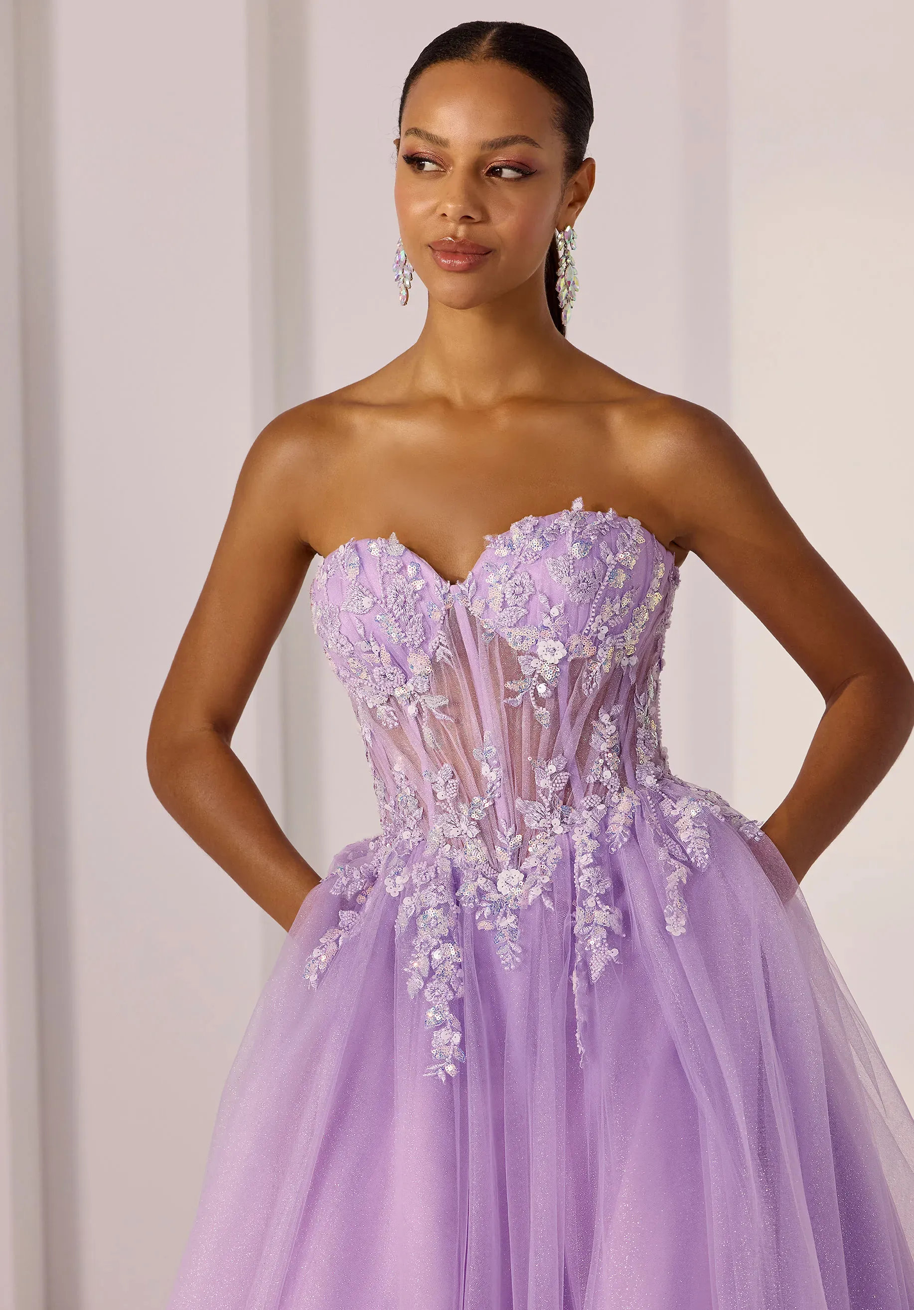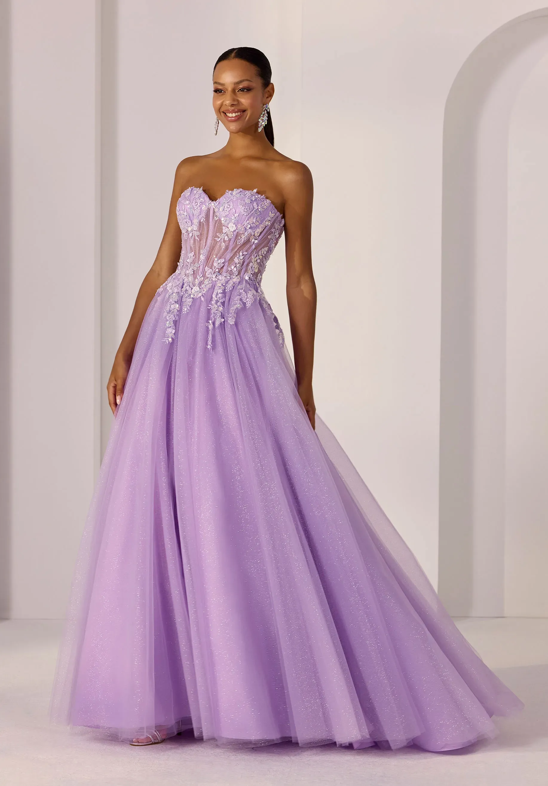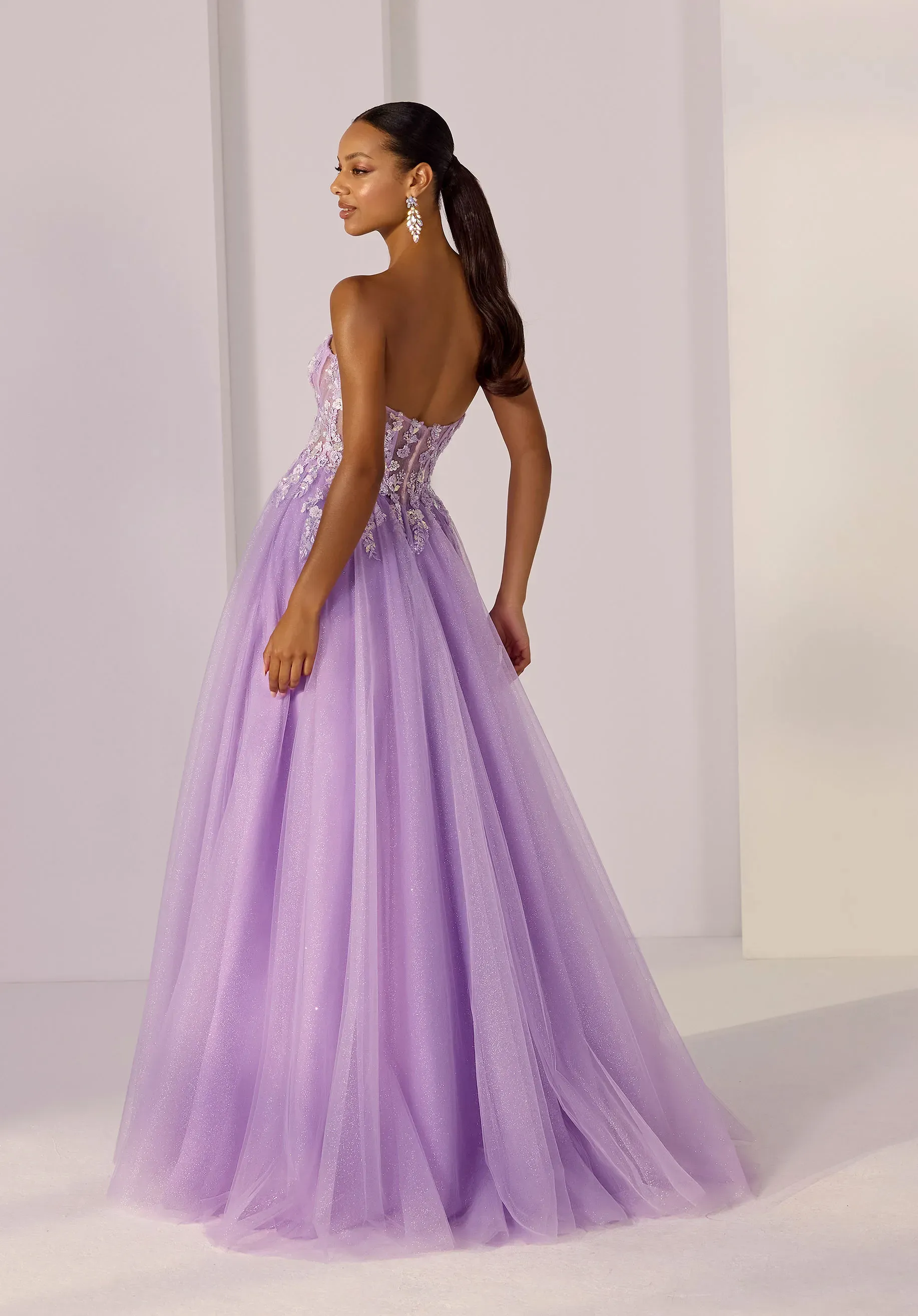 Your spotlight moment is here in this glitter tulle A-line party dress. The strapless sweetheart neckline and sheer bodice highlight the beaded sequin botanical appliqués, while the basque waistline and structured boning creating a sculpted yet ethereal look. Sheer elegance meets glittering glamour.