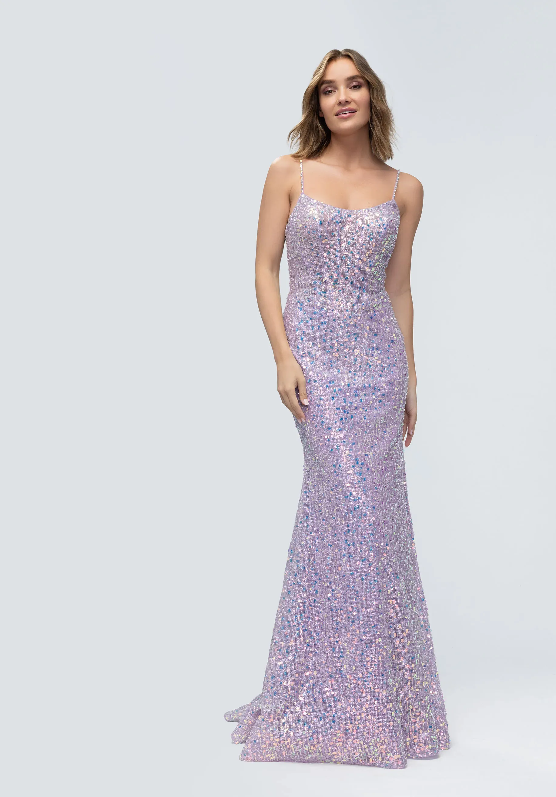 All eyes on you in this fit and flare party dress with a sculpted silhouette and unstoppable sparkle. The simple scoop neckline and delicate thin straps let the sequin-embroidered tulle shine in full effect, while a horsehair-edged train adds movement and drama. From every angle, it’s pure, unapologetic shimmer.