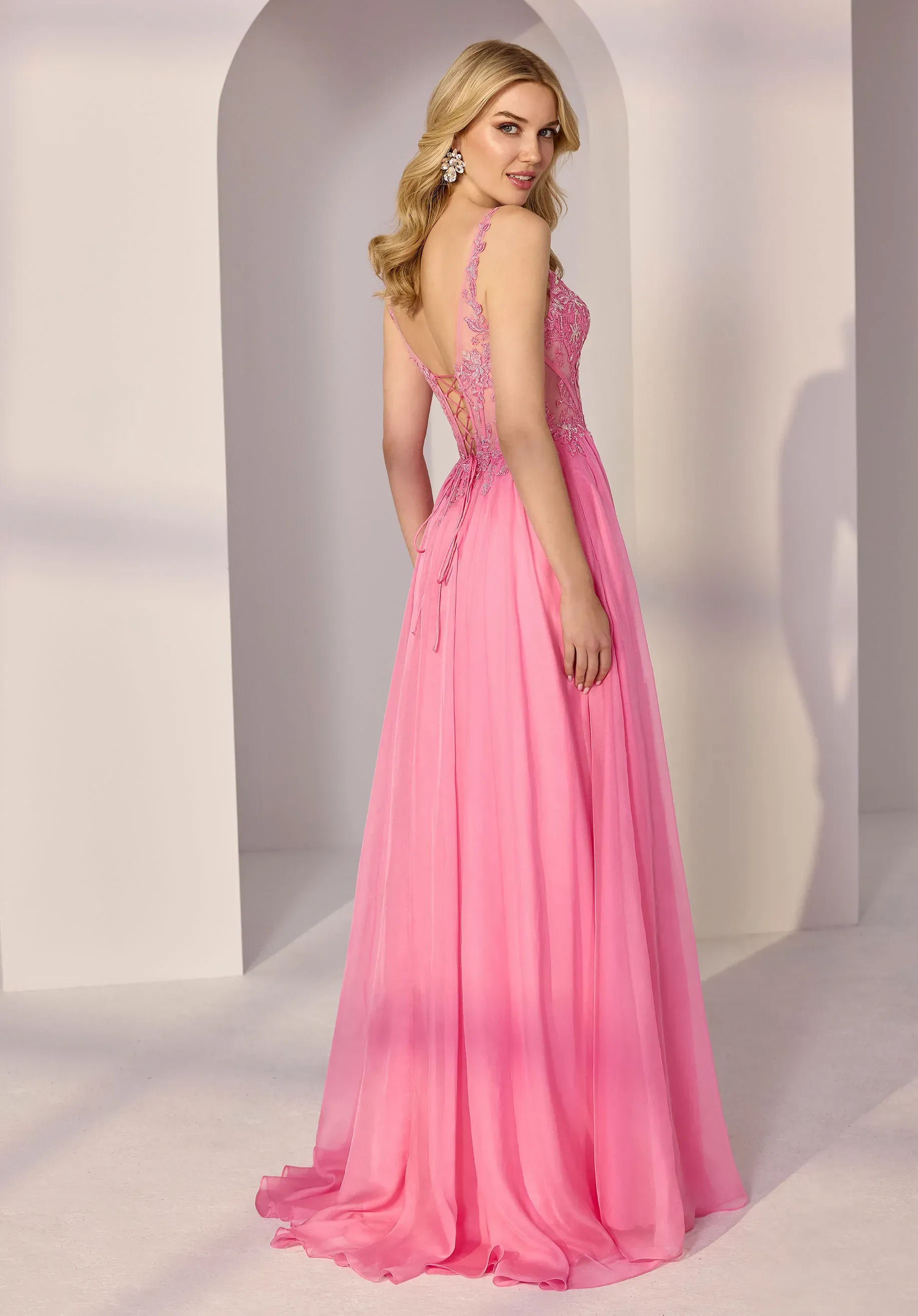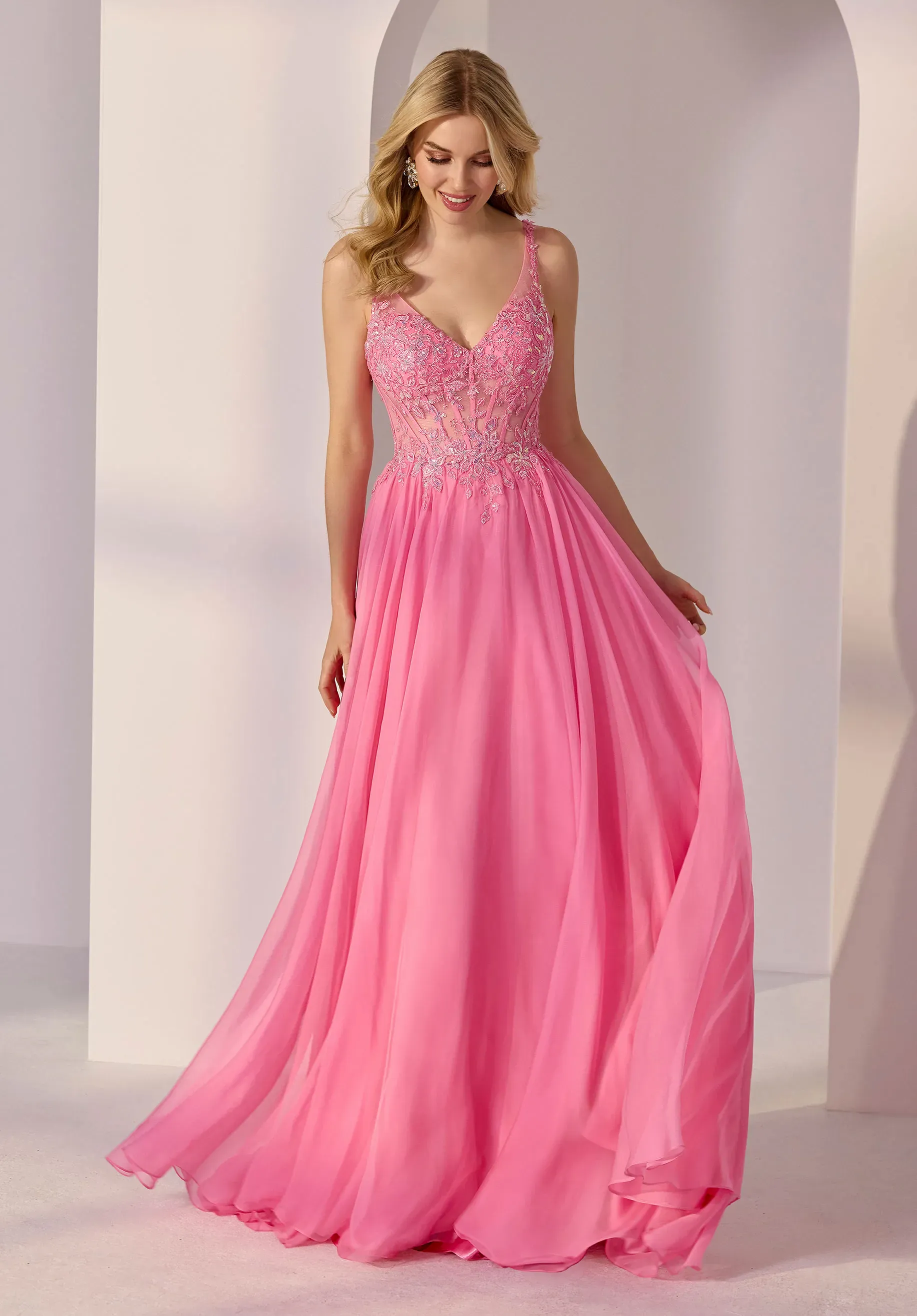 Effortless elegance takes center stage in this chiffon A-line party dress. The v-neckline draws the eye to a structured, boned bodice designed with delicate floral appliqués that add texture and subtle shimmer. A lace-up corset back not only ensures the perfect fit but also lends a touch of romantic detail. Flowing chiffon drapes into a graceful A-line silhouette, creating movement that feels both light and ethereal.