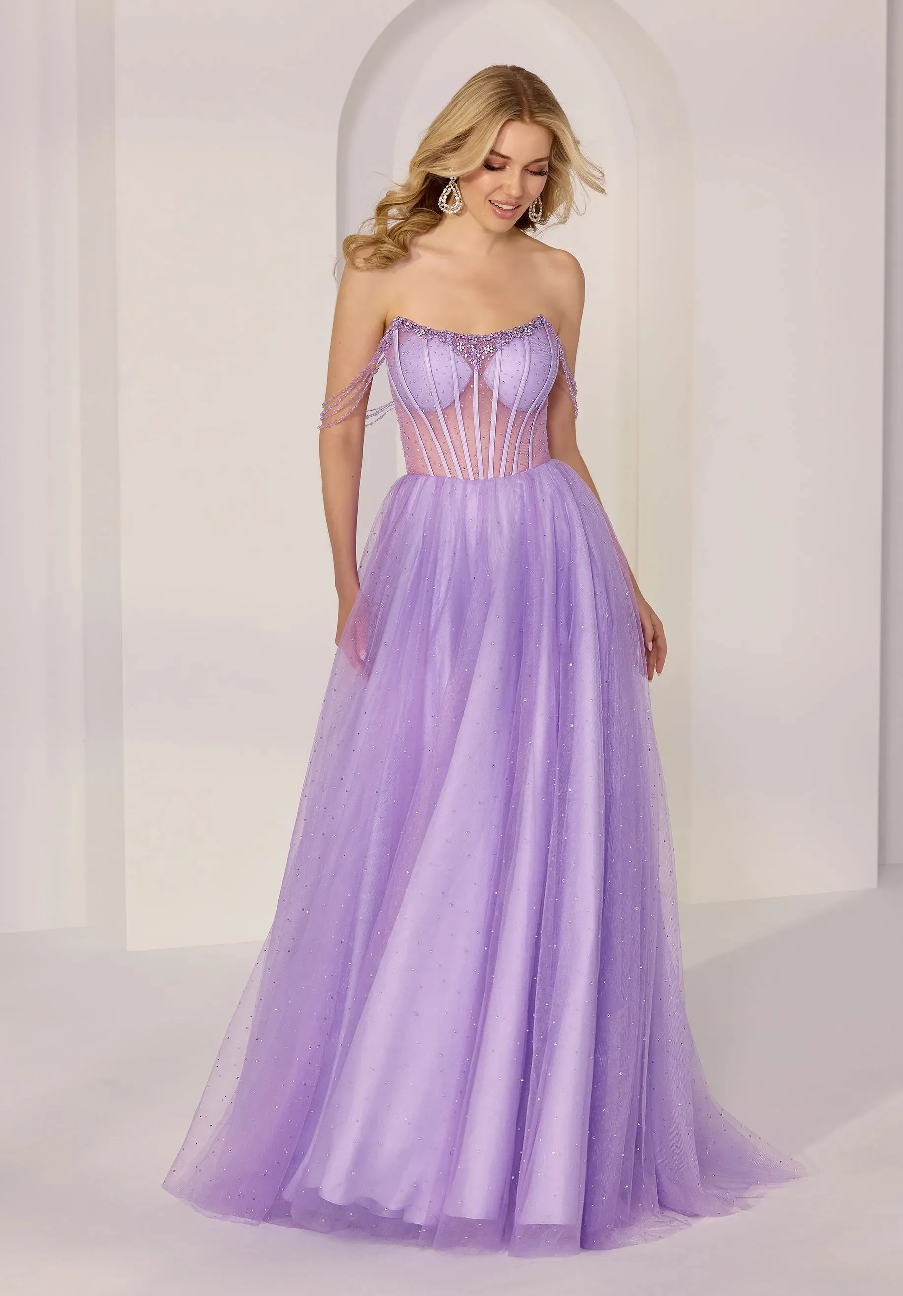 Enter a word of ethereal elegance with this glitter tulle A-line party dress. A sheer scoop neck bodice with beaded trim and structured corset boning sculpts the silhouette, while off-the-shoulder chandelier sleeves add romantic movement and a touch of whimsy. Layers of sparkling tulle catch the light with every step, creating a dreamy moment to get lost in.