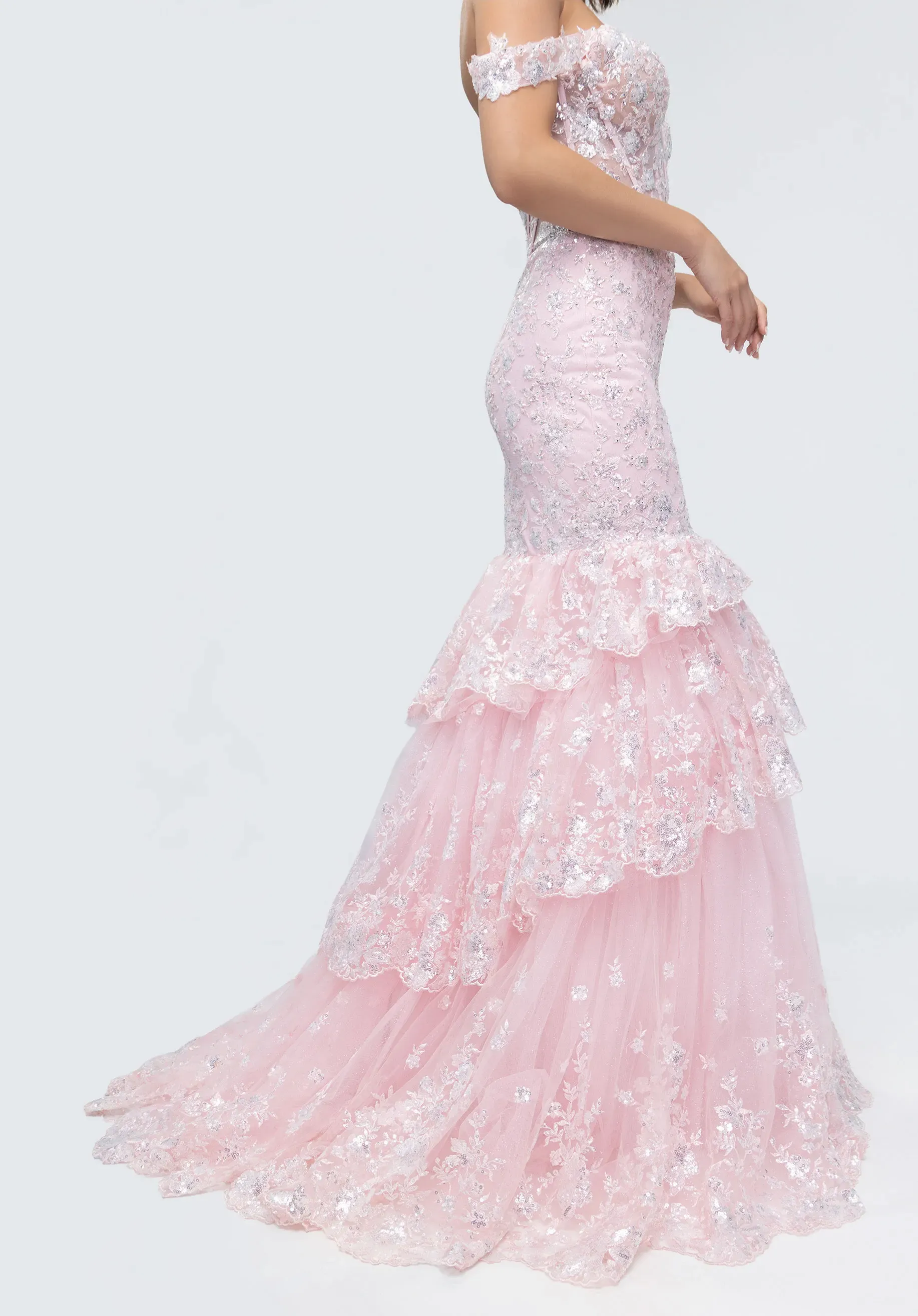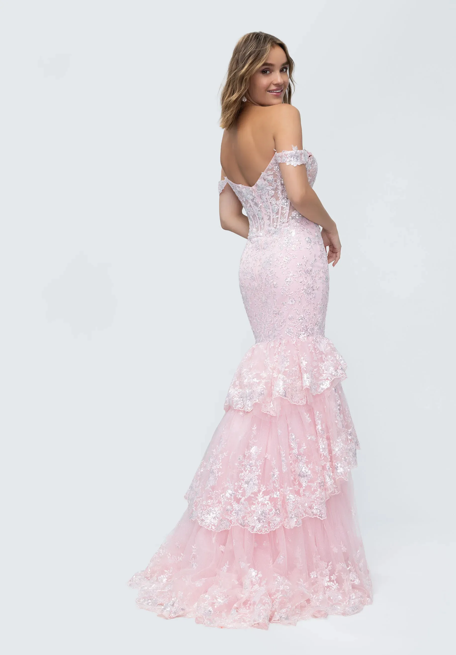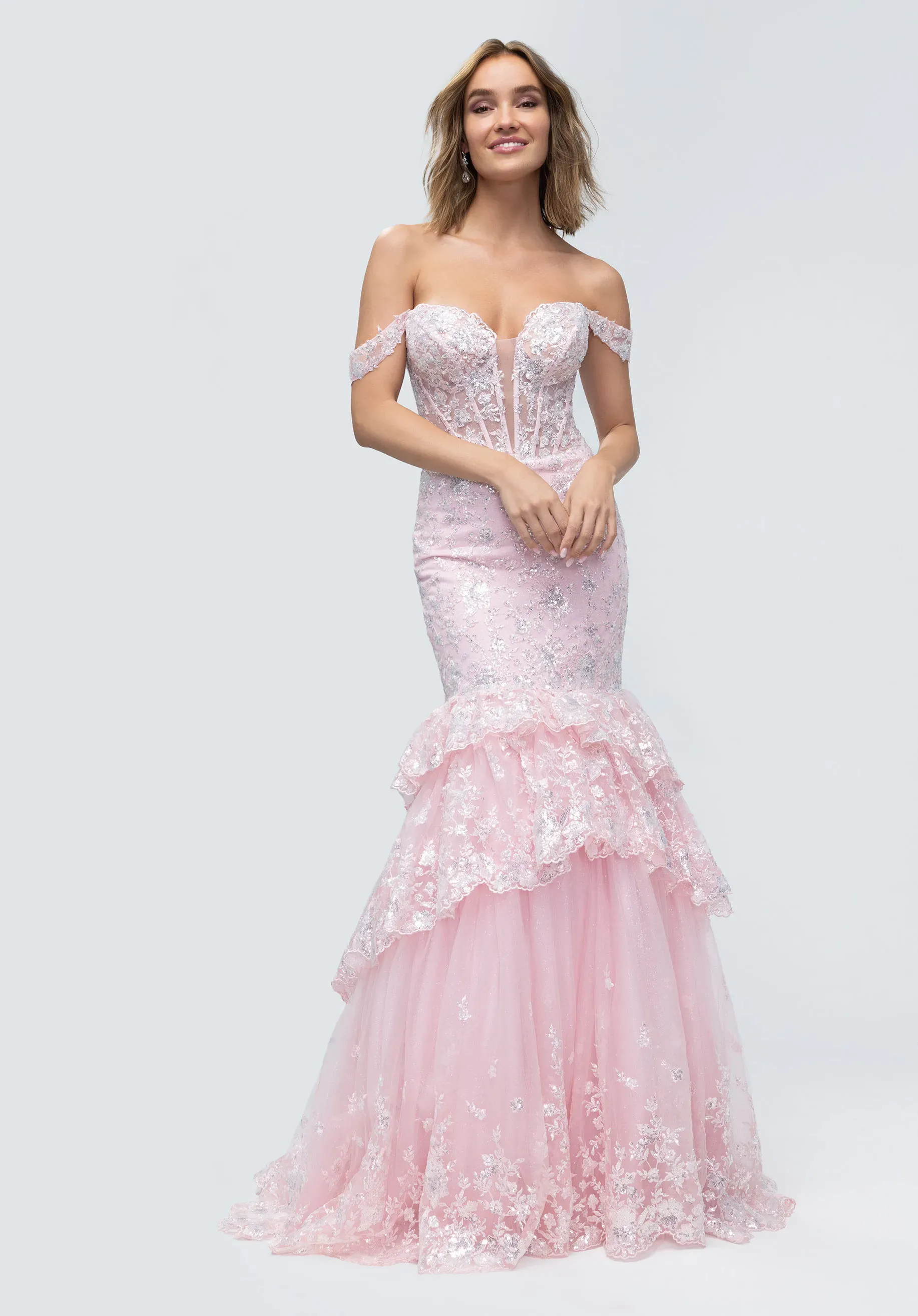 Command attention in this showstopping mermaid party dress. The plunging sweetheart neckline and sheer boned bodice sculpt the silhouette, while off-the-shoulder sleeves add a touch of romantic elegance. Layers of beaded lace over glitter tulle create a tiered skirt that shimmers and moves with every step, blending structured glamour with ethereal sparkle.