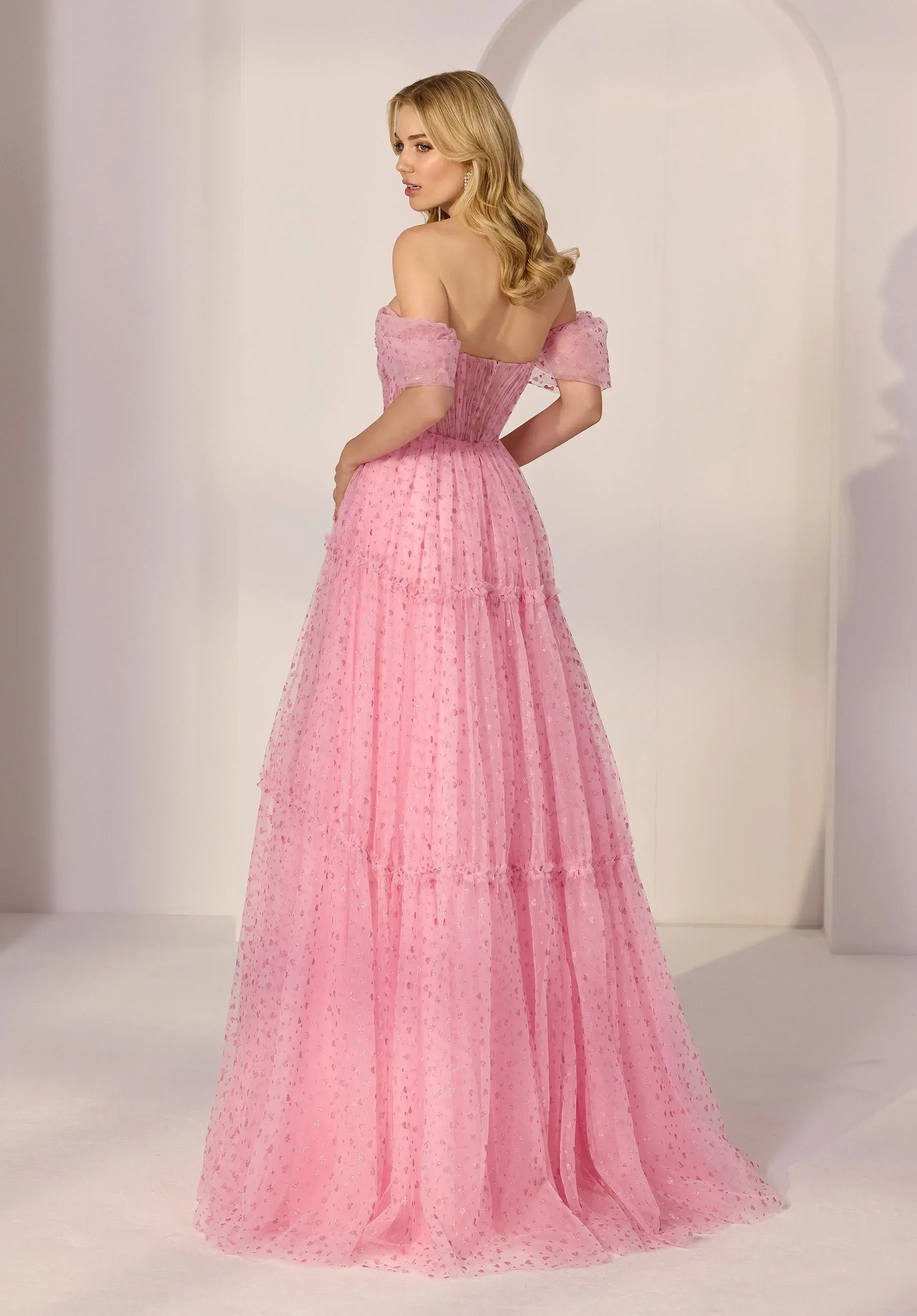 Romantic and playful, this A-line party dress was made to steal hearts. The sheer boned bodice with a ruched sweetheart neckline sculpts the figure, while off-the-shoulder sleeves bring a soft, flirty touch. Falling into a tiered skirt of heart-printed glitter tulle, it shimmers with whimsical charm and just the right amount of drama.