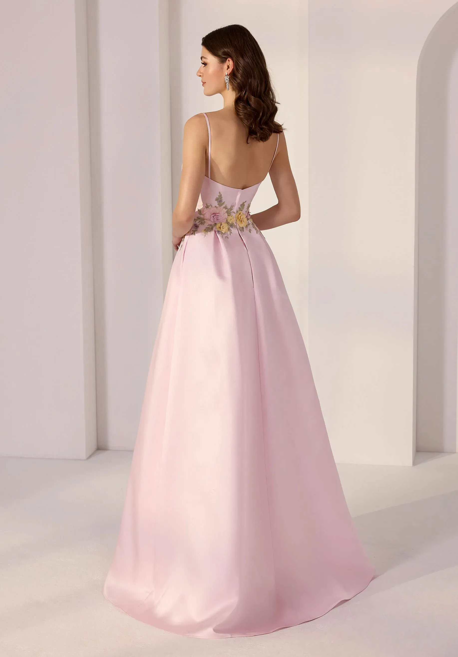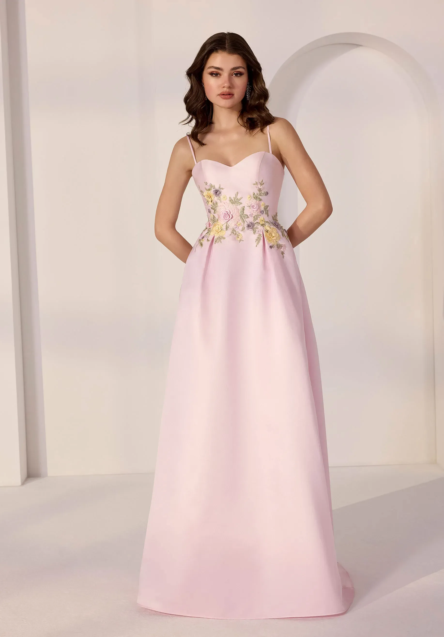 Elevate your party style with this modern A-line party dress. The sweetheart neckline and delicate thin straps create a flattering, feminine frame, while colorful threadwork floral embroidery at the waist adds playful, eye-catching detail. Crafted in structured mikado, the skirt flows effortlessly, combining polished elegance with a pop of playful color.