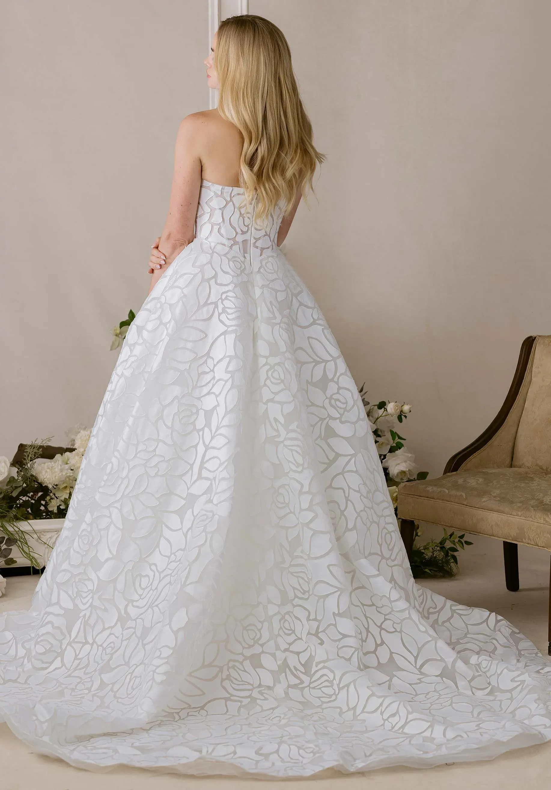 Striking and sculptural, our Florine wedding dress fuses modern sophistication with romantic allure. The plunging sweetheart neckline, edged in shimmering beaded trim, frames the décolletage with architectural precision, while detachable off-the-shoulder sleeves float with ethereal lightness. The basque waist bodice draws the eye in, while the allover rose cut-out motif adds depth and tactile intrigue. The ball gown skirt drifts with soft, controlled movement, creating a silhouette that is at once commanding, poetic, and impeccably refined.