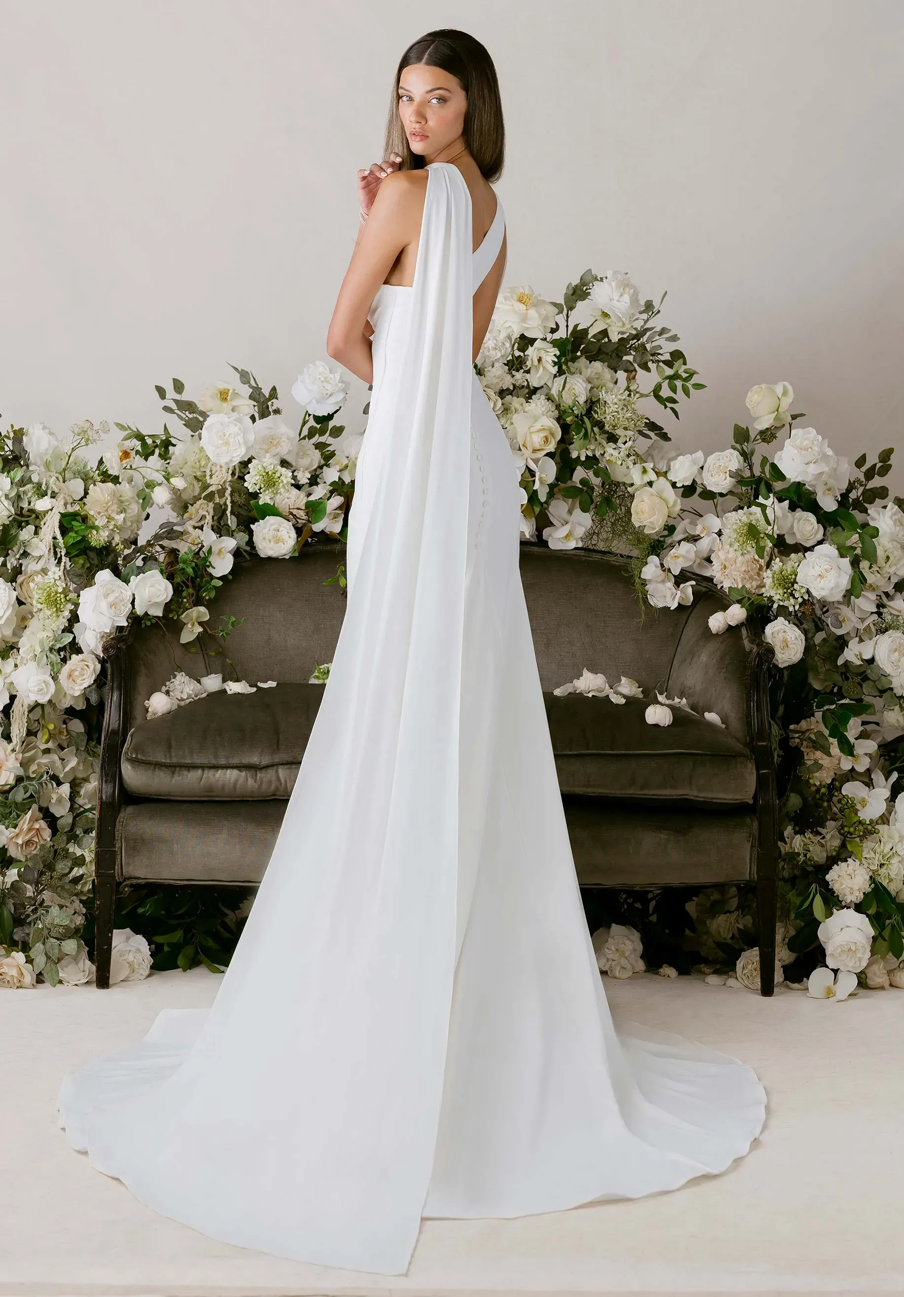 Refined, contemporary, and quietly striking, our Skyler wedding dress features a one-shoulder neckline that flows seamlessly into tailored princess seams, creating a figure-hugging silhouette. Draped shoulder detailing softens the structured lines, adding fluidity and movement to the stretch crepe satin. The result is a gown that balances architectural precision with effortless elegance.