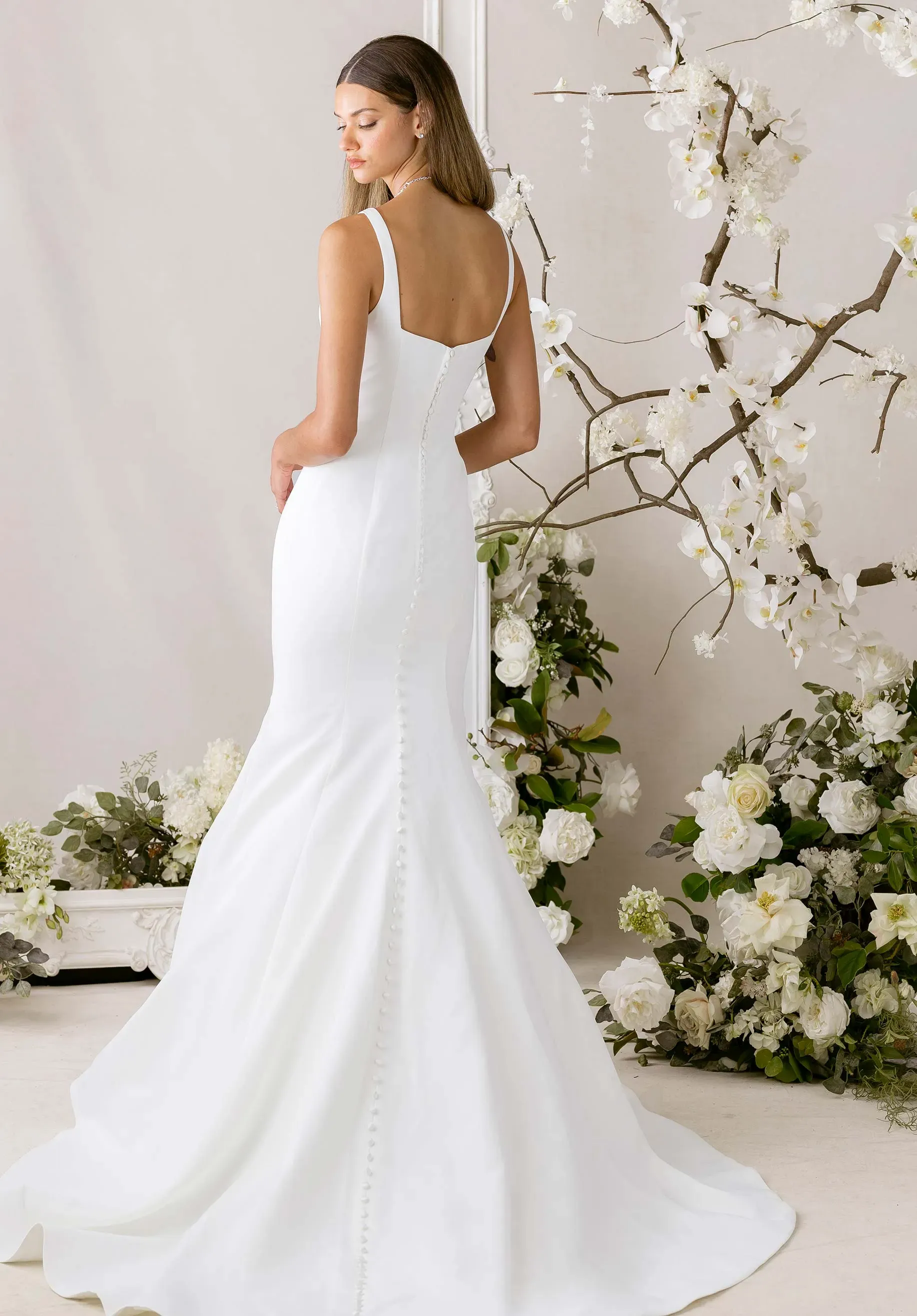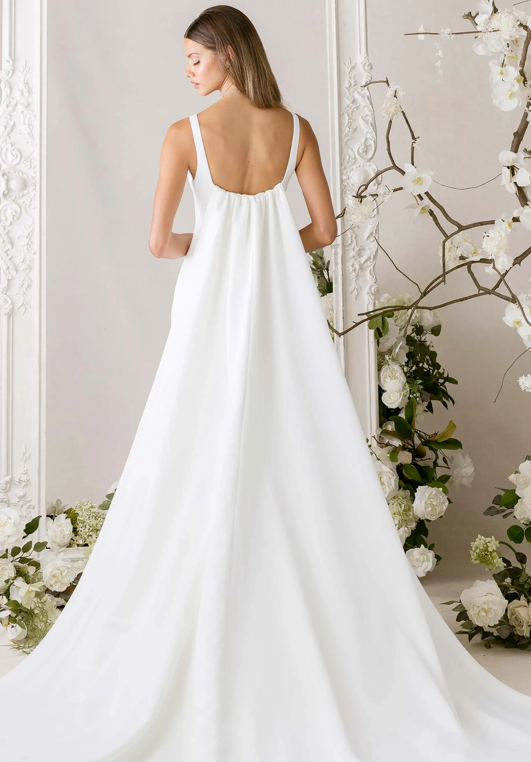 Our Bex wedding dress blends minimalism and romance, creating a look that is both perfectly posed and quietly captivating. The v-neckline graces the sleeveless bodice, while princess seams enhance the natural silhouette, sculpting the figure with clean, precise lines. The square shaped back offers modern simplicity, and a detachable Watteau back adds a soft, flowing drama that moves with graceful ease.