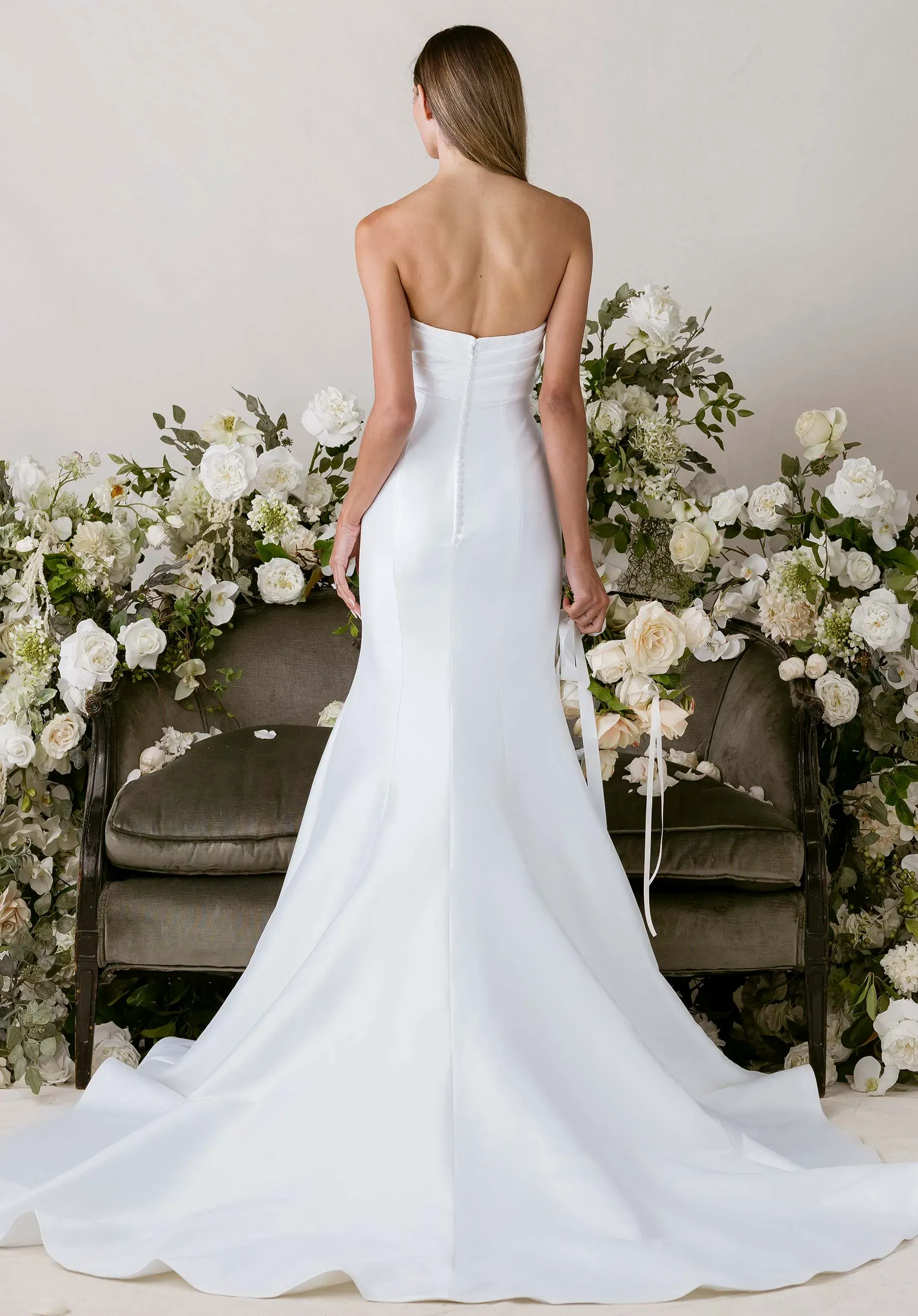 Soft dimension meets sleek sophistication in our Lyren wedding dress. The strapless cat eye neckline frames the décolletage with angular elegance, while the draped empire waist bodice add subtle texture. Elongating princess seams trace the mermaid silhouette, lengthening your figure with graceful flow, while the structured faille fabric balances modern minimalism with effortless poise, creating a look that is both commanding and understatedly elegant.