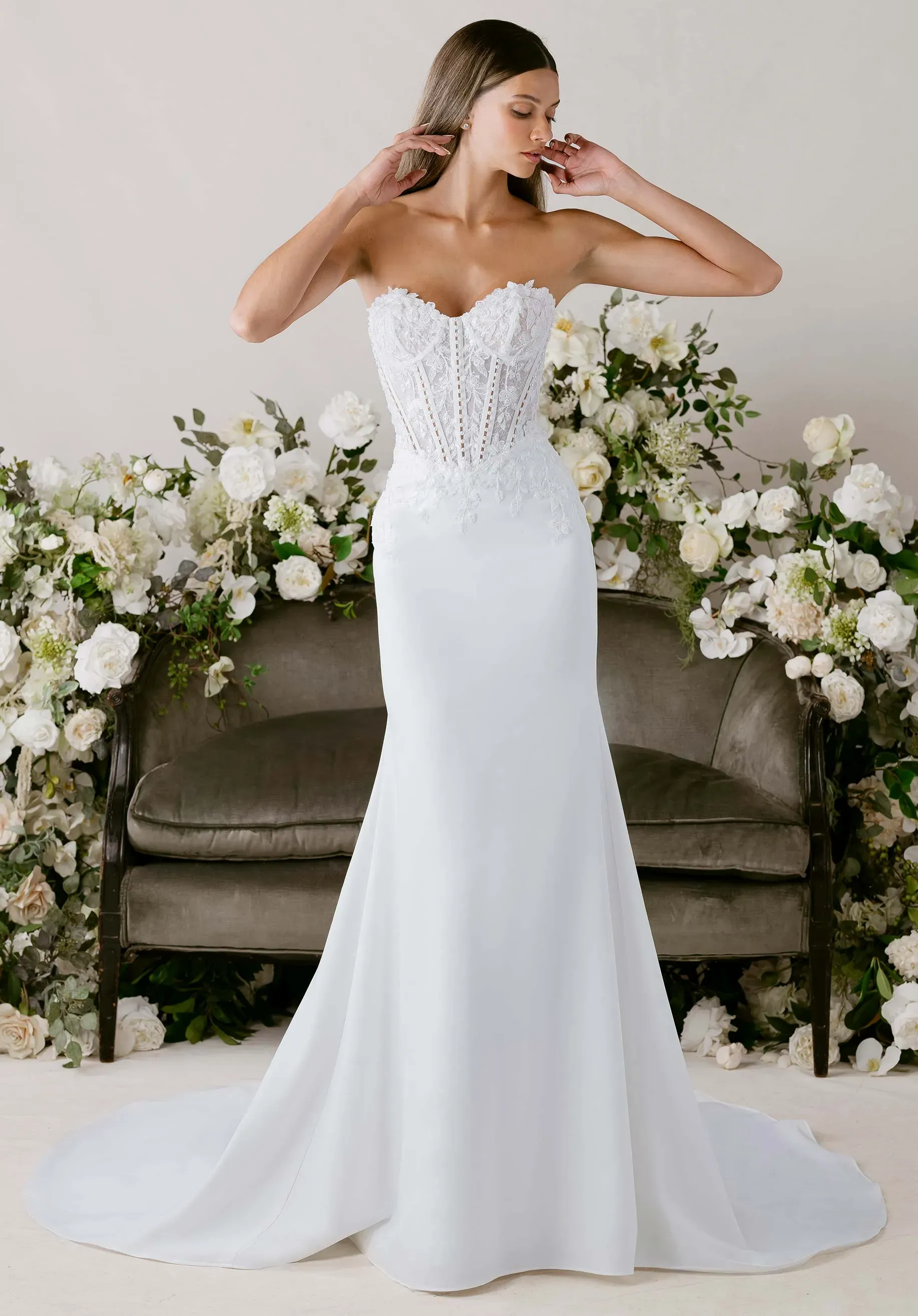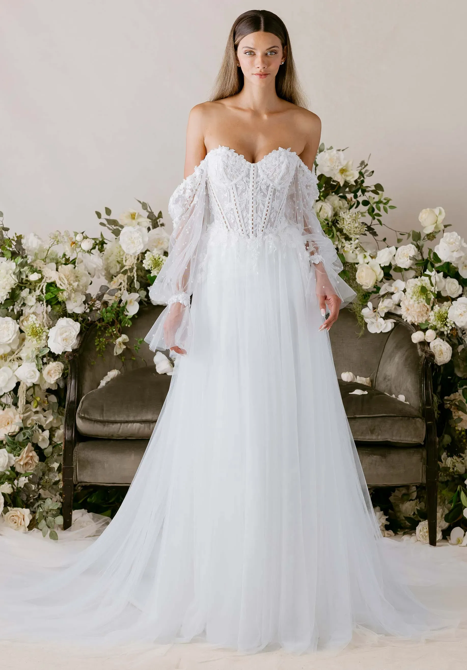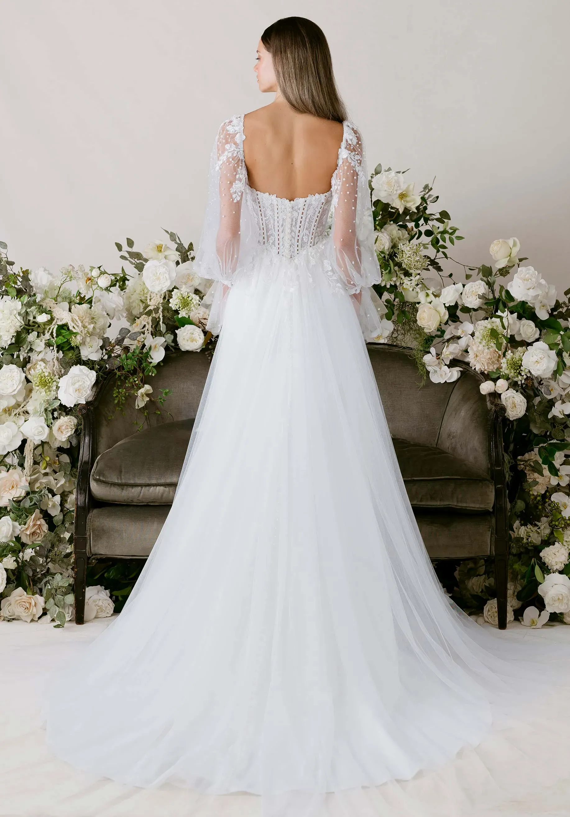A vision of graceful movement, our Clara wedding dress is a fit and flare gown that feels as light as a dancer’s step. The sweetheart neckline is framed by detachable beaded floral tulle sleeves, evoking the softness. Delicate boning, accented by pearls, and a sculpted basque waist create a refined silhouette, while beaded floral appliqués scatter across the skirt like petals in flight. A sweeping train trails behind for a touch of drama, balanced by the ethereal romance of a detachable tulle overskirt that transforms the look with a poetic sense of motion.