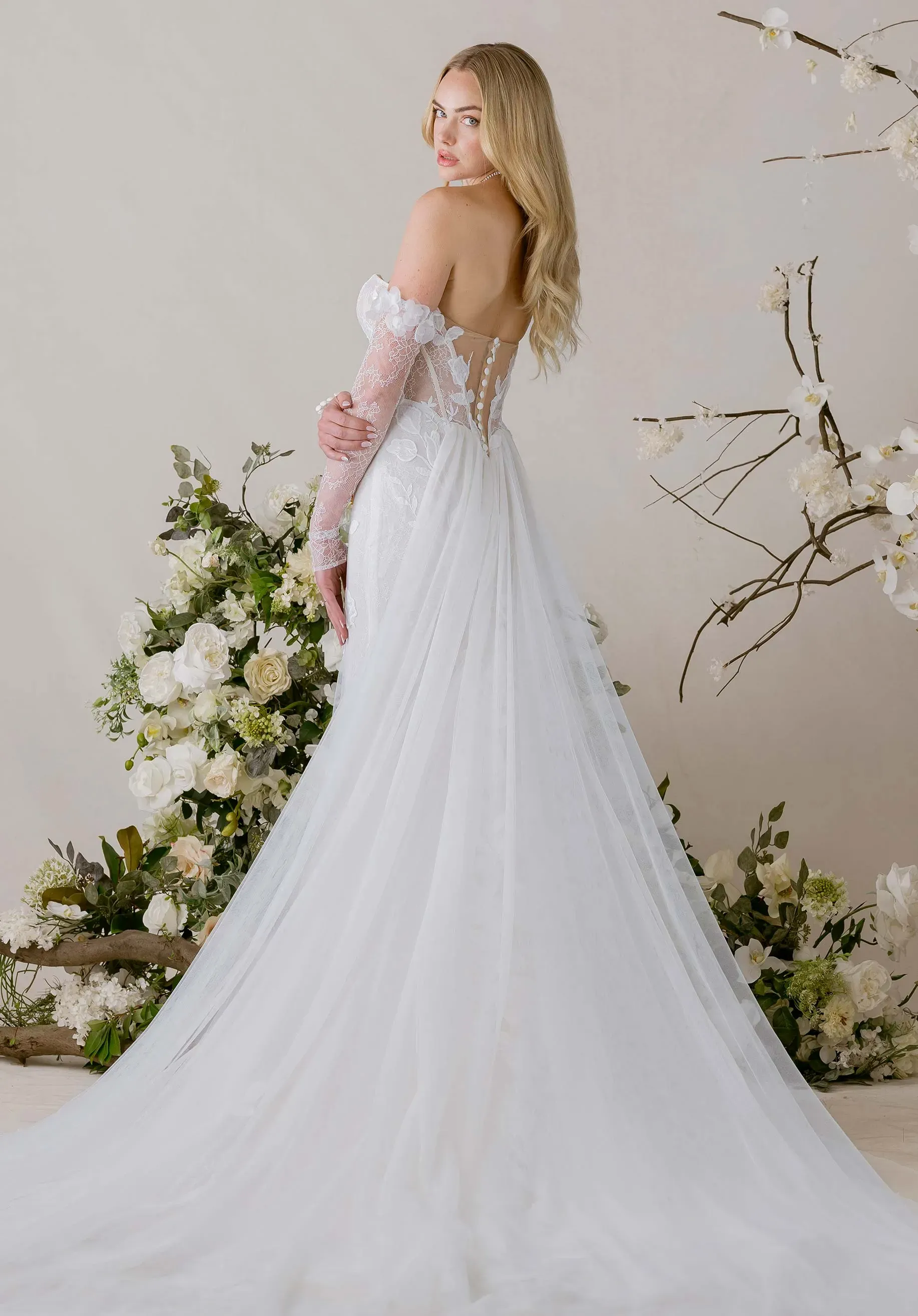 Sensual and romantic, our Elizaveta wedding dress captivates with a strapless sweetheart neckline on a boned corset bodice. The sculpted basque waist highlights every curve and the lace off-the-shoulder long sleeves slip gracefully down the arms. Chantilly lace delicately peeks through the tulle skirt while floral appliqués wind over the gown, adding the texture a beauty of pressed flowers. A flowing tulle train follows with dramatic ease, leaving a lingering impression as you move.
